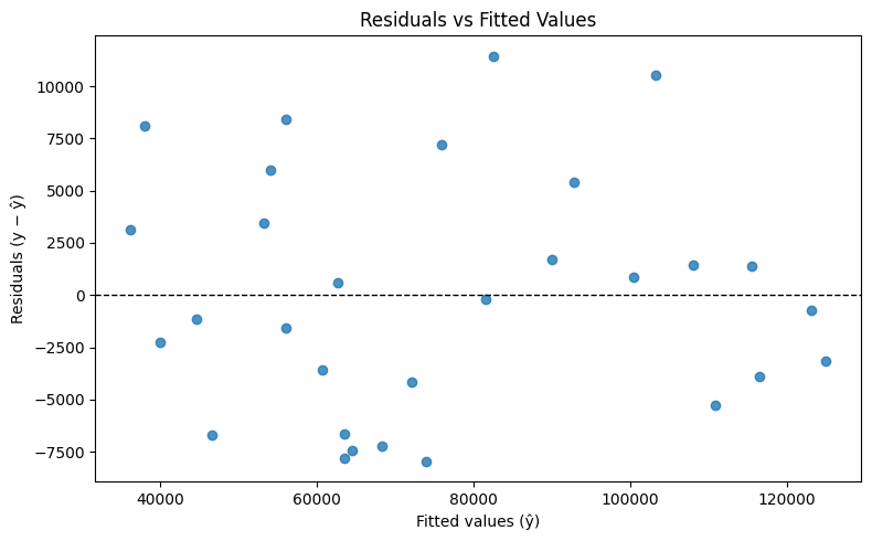 Intercept (β0): 24848.20 Slope (β1): 9449.96 R²: 0.957 RMSE: 5592.04
